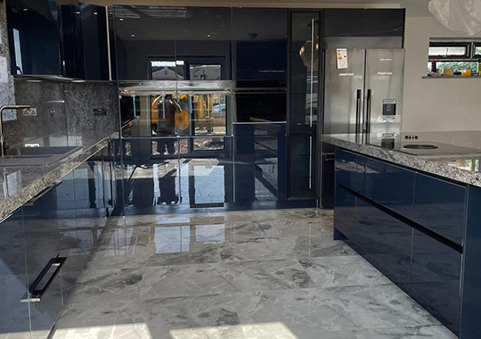 This design shows a Soft Lack Deep Blue front with Polished Tigris Sand Silestone worktop.