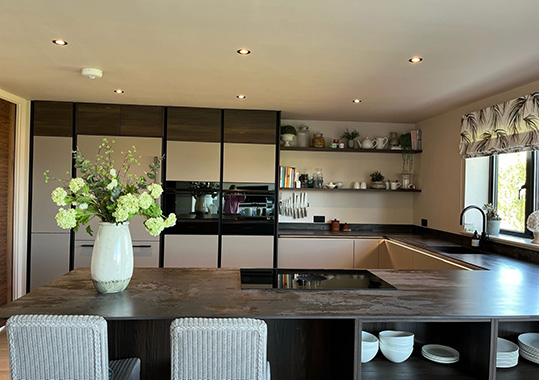 Soft Lack Lava with Walnut Cuba accents, Dekton Trillium worktop.