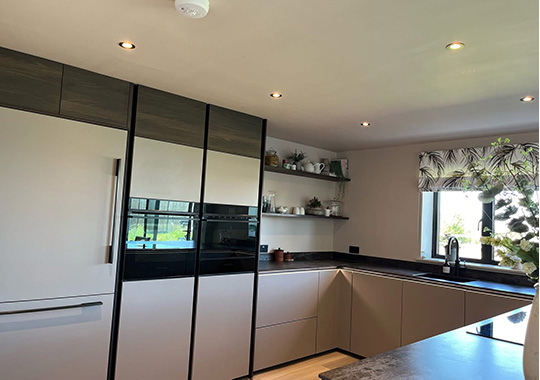 Softlack doors in quartz grey and white, various pullouts, storage systems and lighting packs. Dekton surfaces with a downdraft extractor and built in sockets.